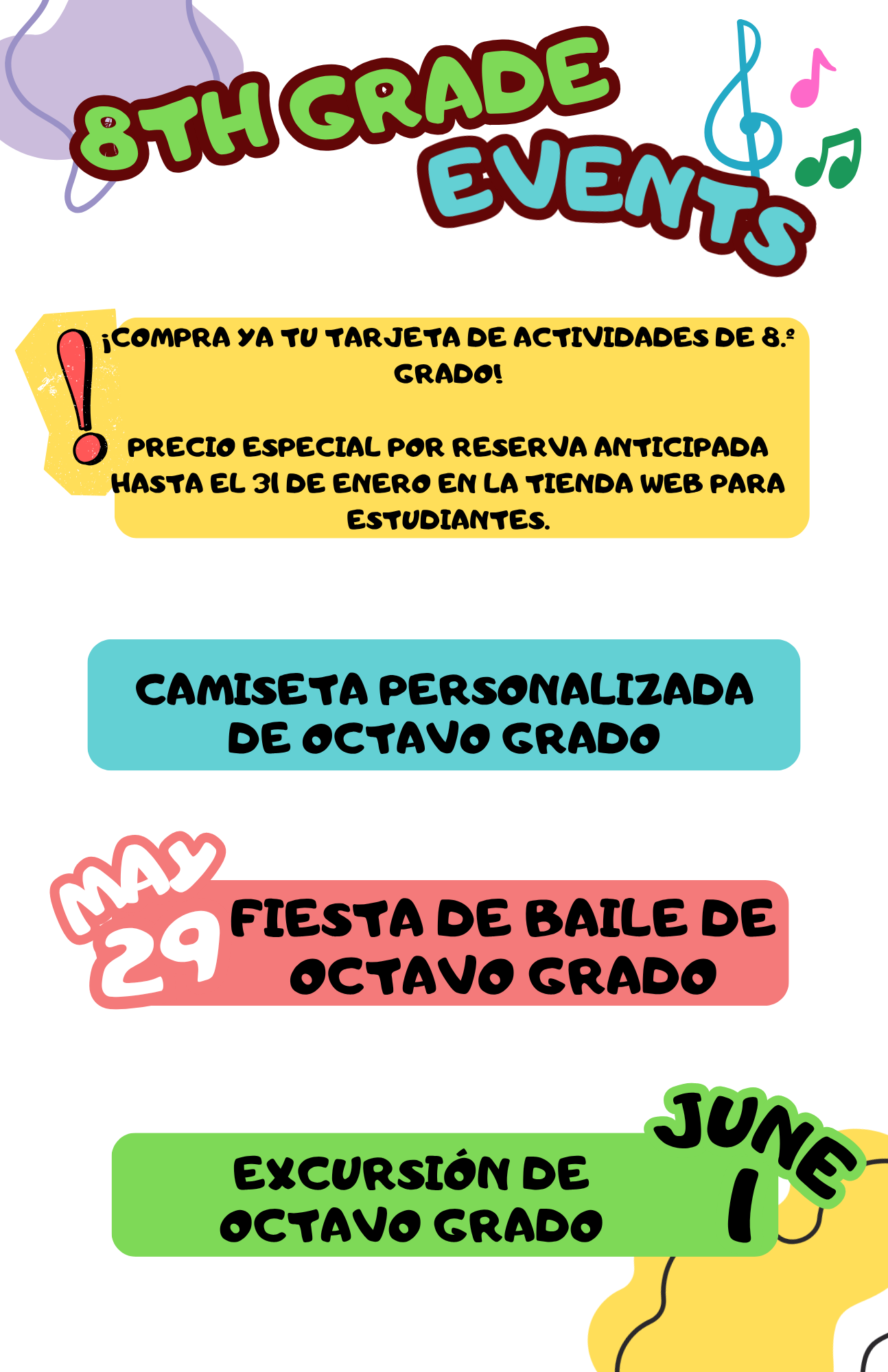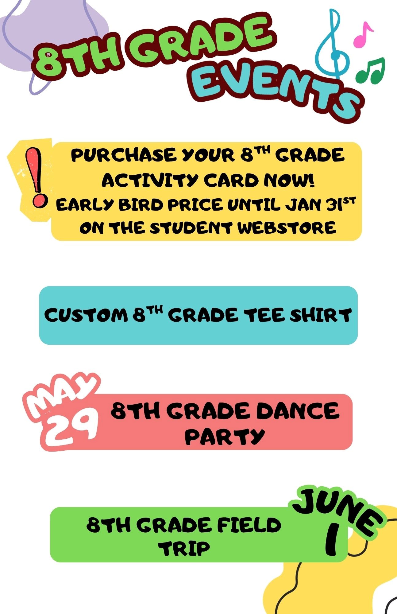 Includes: 8th Grade Field Trip, 8th Grade Dance, and 8th Grade Tee Shirt. Students can attend all or some of the activities. They can decide when the event comes up.
